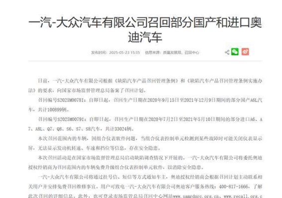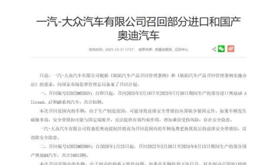导读:2025年12月31日,奥迪宣布了一项重大的召回计划,涉及超2.4万辆汽车。此次召回分为两大批次,涉及的问题分别是进口高端车型的安全带缺陷以及国产电动车的制动软