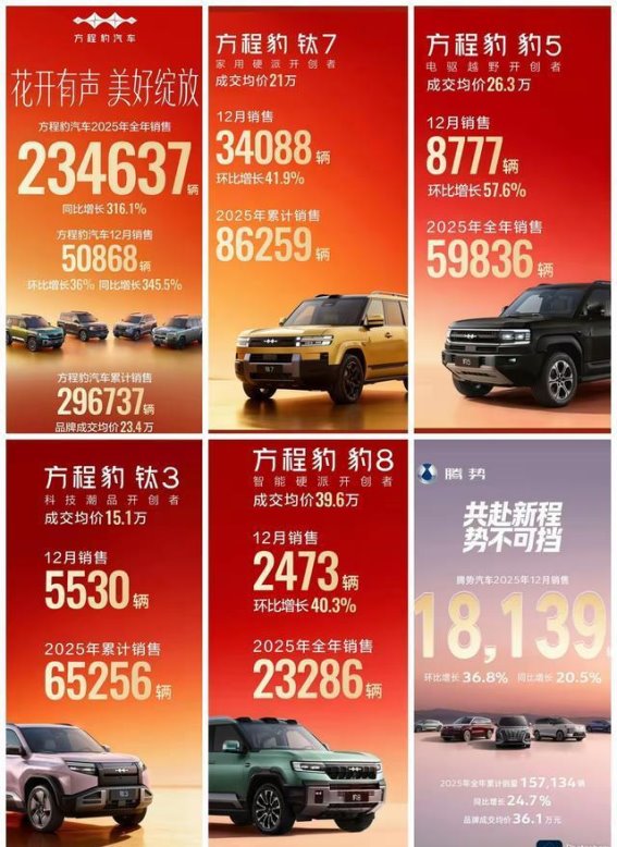 在其他车型方面,豹5的8777辆月销量同样不容忽视,而刚刚上市的豹8也在12月交出了2473辆的成绩。作为入门车型的钛3,月销量达到5530辆,表明方程豹品牌的产品阵容已经初具规模,并且在市场中逐步站稳了脚跟。