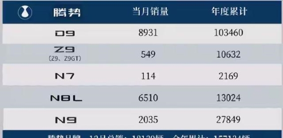 相比方程豹的亮眼表现,腾势品牌的表现则显得略为沉寂。12月,腾势品牌的销量为18139辆,全年累计销量为15.71万辆,未能达到市场的预期。腾势的销量主要依赖于旗舰车型D9,12月销量为8931辆,全年累计销量为103460辆,这使得D9成为腾势品牌的重要支柱。