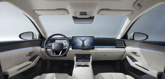 内饰方面,新款秦L DM-i延续了比亚迪一贯的简洁现代风格。车内的平底式方向盘与悬浮式中控屏,使得车内布局更加简洁而富有科技感。新车搭载了无麦K歌、手机车机互通等功能,高配车型则提供了冷暖冰箱、抬头显示等配置,提升了车主在驾驶过程中的便利性和娱乐性。车内的材料质感与做工也做了进一步优化,为车主提供了更高的舒适度。