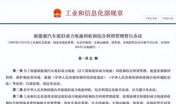 在新能源汽车废旧动力电池管理方面,工业和信息化部等六部门联合发布了《新能源汽车废旧动力电池回收和综合利用管理暂行办法》,自2026年4月1日起施行。政策提出“全渠道、全链条、全生命周期”的管理思路,涵盖电池生产、车辆报废、换电运营、维修更换等各类废旧动力电池产生环节,实现规范化管理。动力电池数字身份证可追溯来源和去向,“车电一体报废”制度堵住流向漏洞,并配套刚性处罚措施。这一全链条监管体系不仅解决了废旧电池回收混乱问题,保障资源循环利用,也提升了消费者对新能源汽车的信任,为行业可持续发展和“双碳”目标的实现提供了制度保障。