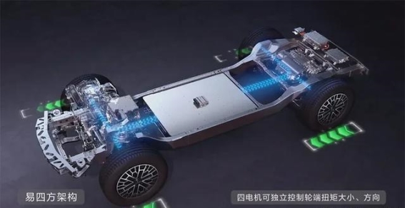 易四方系统的核心在于“四电机”独立控制,通过四个独立的电机分别控制每一个车轮,实现了毫秒级扭矩矢量分配。这一系统与传统的机械差速器不同,不仅能精准调节每个车轮的动力、转速与扭矩,还能根据路面状况做出快速反应,保证车辆在各种复杂环境下依然保持高效的操控性能。